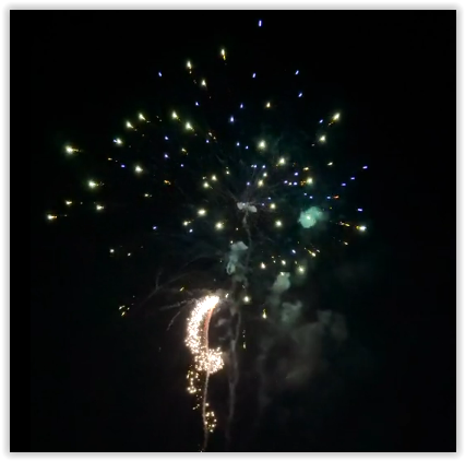 16 shots of big silver spinners that burst into dark blue stars with green strobe